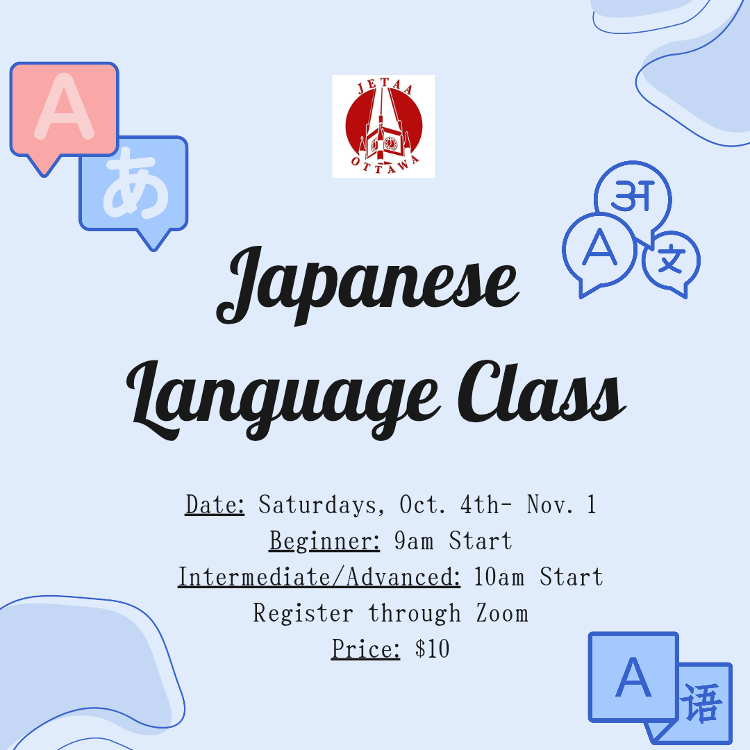 Japanese language classes are back on Saturdays starting October 4th! If you’re a JET alumni who wants to brush up on your Japanese skills, join us online on Saturday mornings! To register, please send $10 via 振り込み Interac™ eTransfer to treasurer@jetaaottawa.ca with security answer “Japanese”, then fill out the Zoom webinar form!